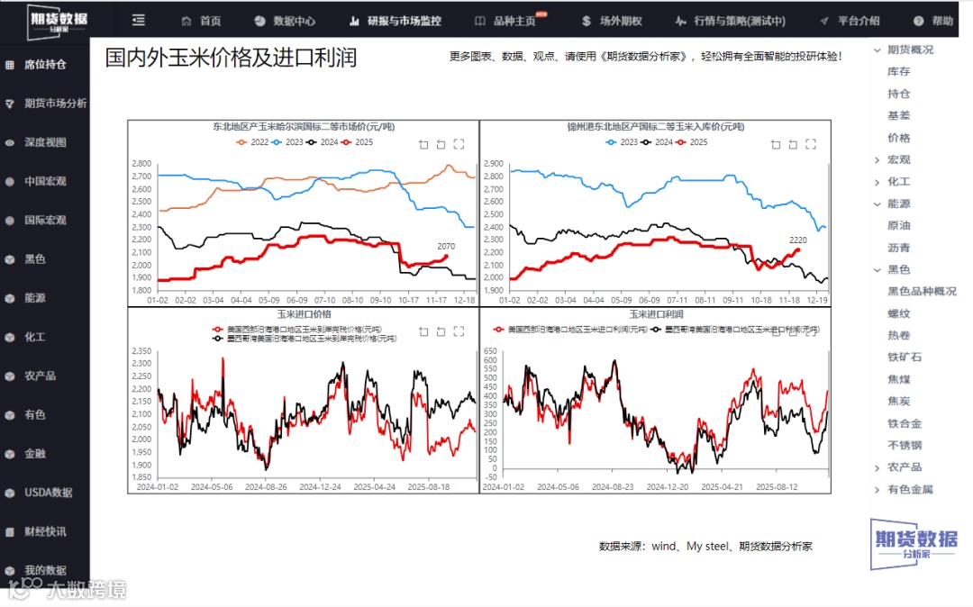新季玉米丰产已成定局,但供应释放节奏受制于物流瓶颈。东北主产区因运输不畅导致北港到货量明显偏低,锦州港收购价维持在2220-2230元/吨区间,月内涨幅达140元/吨。同时,基层农户惜售情绪浓厚,贸易商逢低采购意愿强烈,形成“供应足但流通紧”的矛盾局面。进口方面,美国西部沿海港口玉米进口利润428.91元/吨处于历史高位,墨西哥湾进口利润314.44元/吨亦在中位区间,但1-10月进口量锐减,未来若利润维持高位可能刺激进口放量。