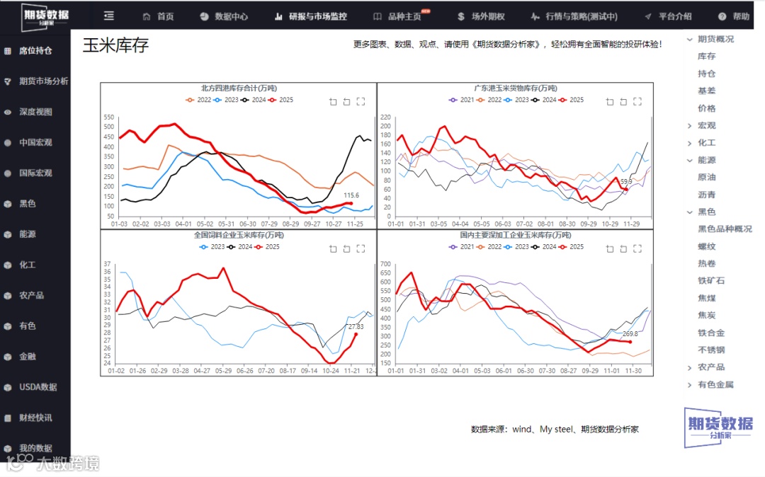 从库存层面看,当前玉米市场呈现“整体低位、局部承压”特征。深加工企业玉米库存约为269.8万吨,处于历史同期中位偏低位,且月内下降12.9万吨,反映加工企业补库意愿有限。港口库存方面,北方四港库存115.6万吨同样处于中位偏低水平,但月内增加21.1万吨,暗示供应压力逐步积累;广东港库存59.9万吨连续下降,显示南方销区到货量偏紧。最值得关注的是饲料企业库存仅27.83万吨,处于历史最低位,虽然月内增长3.73万吨,但仍凸显下游备货不足的现状。这种库存结构表明,市场短期受区域供需错配支撑,但中长期面临库存重建压力。