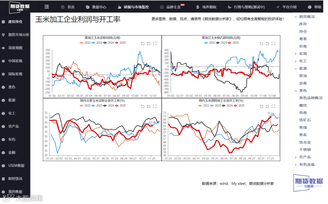 需求侧呈现深加工弱的特征。深加工需求表现疲软:黑龙江玉米淀粉利润50元/吨处于中位偏低水平,虽然月内回升30元/吨,但仍较去年下降53元/吨;玉米制乙醇利润-252元/吨持续亏损,月内再降56元/吨。开工率数据印证了这一趋势,淀粉企业开工率61.38%同比降11.51%,酒精企业开工率71.34%虽同比增13.58%,但利润约束下难以大幅提升消费。