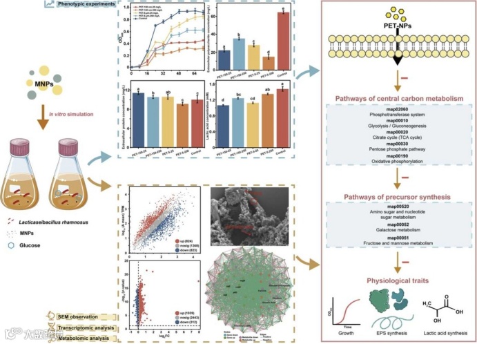 MNPs广泛存在于多种生态系统,可通过多种暴露途径在人体胃肠道中富集,进而威胁肠道稳态。然而,MNPs是否以及如何对肠道益生菌产生生理毒性,目前尚不明确。本研究以L. rhamnosus为研究对象,采用IVD模拟MNPs的消化过程,显示MNPs能够抑制细菌生长及其EPS和乳酸的合成。该毒性效应具有材料组成依赖性(PET > 聚苯乙烯 > 聚氯乙烯),在纳米尺度下更为显著,且随浓度升高而增强。在抑制效应最强的条件下(150.0 nm、250.0 mg/L PET的IVD处理),扫描电镜结果显示,L. rhamnosus分泌的EPS会与MNPs颗粒结合并黏附于菌体表面,可能导致物理阻塞和细胞膜损伤。转录组学与代谢组学联合分析表明,经IVD处理的PET纳米塑料(PET-NPs)显著下调核心基因(如galKlog2FC = −5.40;bglAlog2FC = −6.58),并降低中心碳代谢通路中多个关键节点(包括磷酸转移酶系统、糖酵解途径、三羧酸循环、磷酸戊糖途径和氧化磷酸化)的代谢物水平,从而损害葡萄糖摄取/代谢及能量生成,最终限制EPS和乳酸合成所需的前体物质供给。本研究揭示了MNPs通过抑制中心碳代谢破坏葡萄糖代谢-产物合成轴的作用机制,为MNPs对益生菌代谢的抑制作用提供了有力证据,也为评估MNPs污染潜在健康风险提供了机制性见解。