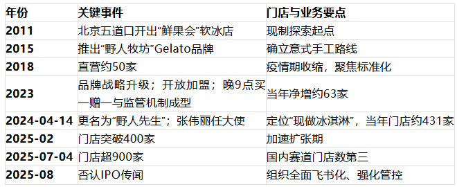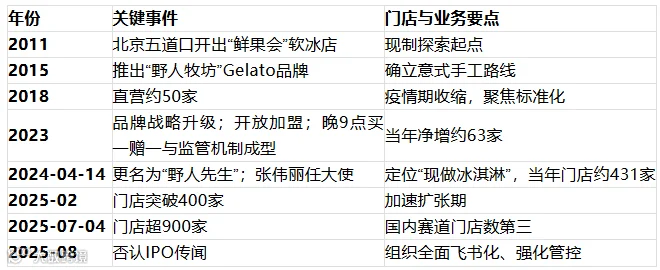 2011:创始人崔渐为在北京五道口(北京语言大学)开出首家软冰店“鲜果会”,以现制理念探索冰淇淋的新鲜口感与门店模型。随后在2015年正式推出意式手工冰淇淋品牌“野人牧坊”,确立以Gelato为核心的产品路线。早期发展缓慢,至2018年仅约50家直营店,疫情期还出现收缩,门店主要聚焦北京等少数城市,重心放在供应链与前店后厂的标准化打磨。