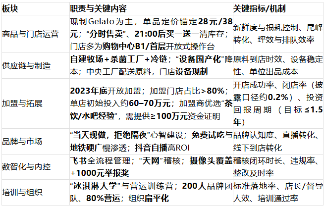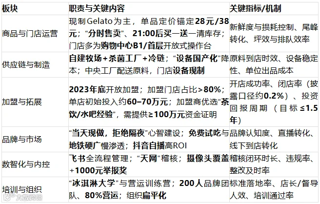 上述板块共同围绕“现制冰淇淋连锁”的主业,形成“前端体验(品牌/门店)—后端效率(供应链/设备)—组织能力(数智化/培训)”的闭环。