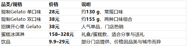 高价与消费理性:在“可以买贵的,不能买贵了”的趋势下,持续以28–38元价格带驱动复购,需要产品力与情绪价值不断强化;横向对比部分国际Gelato品牌在海外更低的定价,国内价格锚定与价值沟通需持续验证。