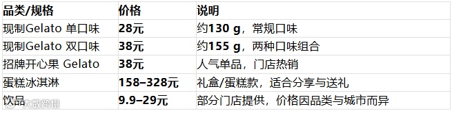 品类红利与价格带卡位:Gelato在中国仍处扩容期,品牌以“低脂、现制、可视化”切入,并以28–38元价格带实现对“高端现制”与“大众化”之间的卡位,既避开低价内卷,又维持可感知的品质差。
