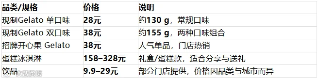 现制意式冰淇淋(Gelato):单口味约130 g、双口味约155 g;门店配电子秤称重按克出品,确保净含量。常规口味价位为28元/38元,招牌如开心果等热销。品牌强调“当天现做,拒绝隔夜”,并标注“正在售卖/即将出锅”等提示以强化新鲜感知。