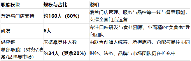 组织规模与结构:品牌层面团队约200人,其中约80%为营运人员;总部职能保持扁平化与强执行,三位创始人共用办公室、决策链路短。研发团队约6人,小而精,专注风味与食材溯源。