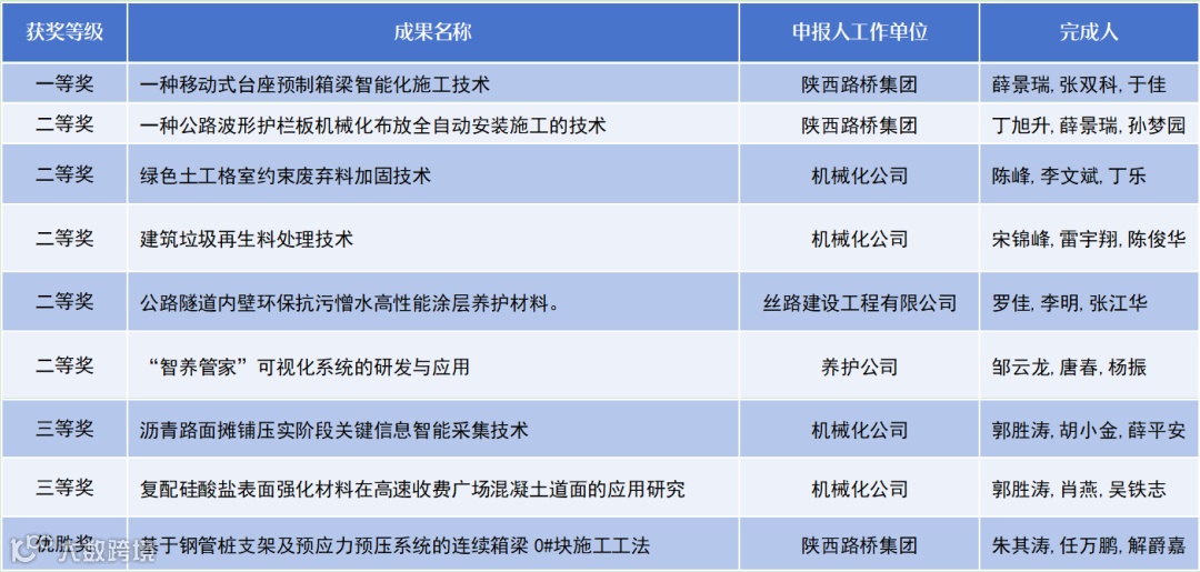陕西路桥集团此次有 3 项成果上榜,其中“一种移动式台座预制箱梁智能化施工技术”获一等奖,该技术创新施工模式,实现工厂化流水线作业;“一种公路波形护栏板机械化布放和全自动安装施工的技术”获二等奖,通过机械臂提升施工安全与效率;“基于钢管桩支架及预应力预压系统的连续箱梁0#块施工工法”获优胜奖,有效解决施工难题,具备良好推广前景。