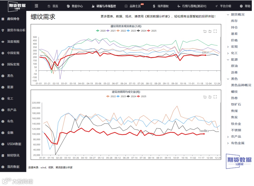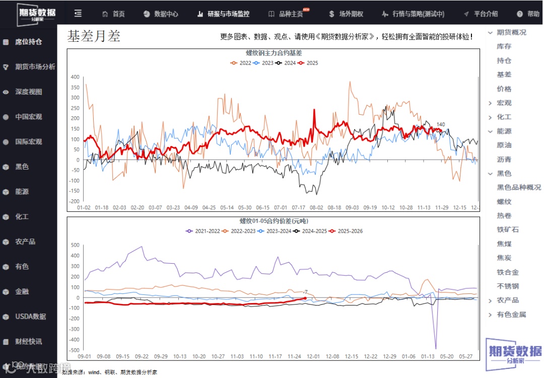 建材周均成交量仅10.04万吨,处于历史同期最低位,环比微增0.24%,但近一个月仍下降188.2吨。需求端受房地产下行压制,中长期难有起色;短期虽部分工地赶工支撑表观消费,但北方气温下降将导致需求步入季节性淡季。数据表明,五大钢材周消费量环比下降0.7%,其中建材消费偏弱,板材略强。整体需求疲软仍是压制价格的核心因素。