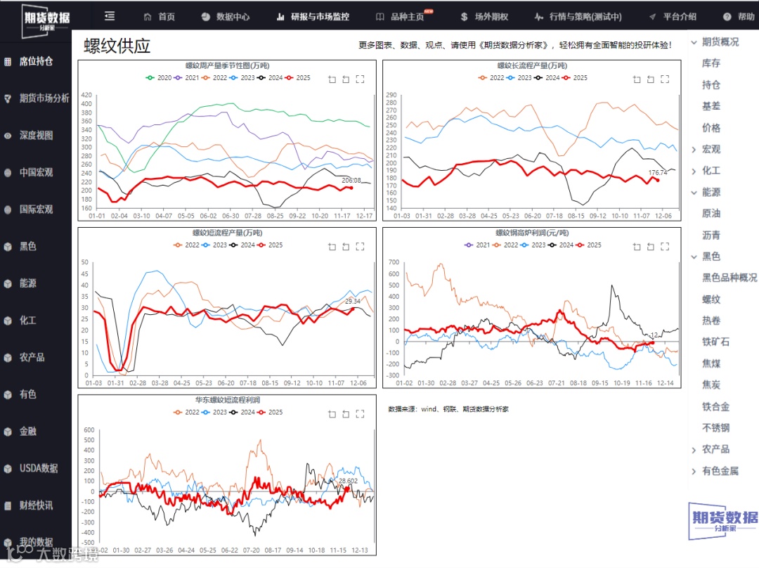 螺纹钢周产量为206.08万吨,处于历史同期最低位,环比下降0.9%,同比降幅达9.57%。长流程产量受利润低迷和检修影响持续收缩,环比下降2.45%;短流程产量则因电炉利润好转环比增长9.52%,但同比仍偏低。近期五大钢材供应环比增加0.7%,但螺纹钢自身供应矛盾不突出。未来需关注:若短流程利润进一步修复,产量或逐步回升,但长流程亏损制约整体供应弹性。