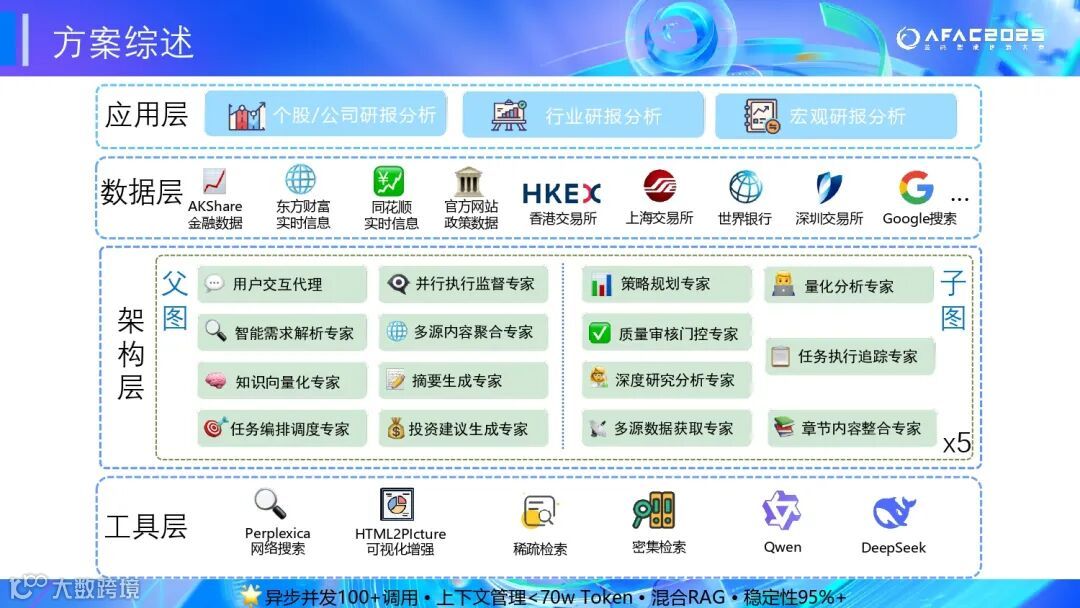 本任务致力于解决通用预训练大模型财务分析能力缺失、信息获取与整合不足以及大模型幻觉与结构化输出困难三大核心问题,通过引入Agent系统、检索增强生成(RAG)技术、工具库、模型上下文协议(MCP)以及Agent2Agent(A2A)协议等前沿技术,提升大模型在金融场景中的可用性,实现自动化生成具有决策价值的专业研报。