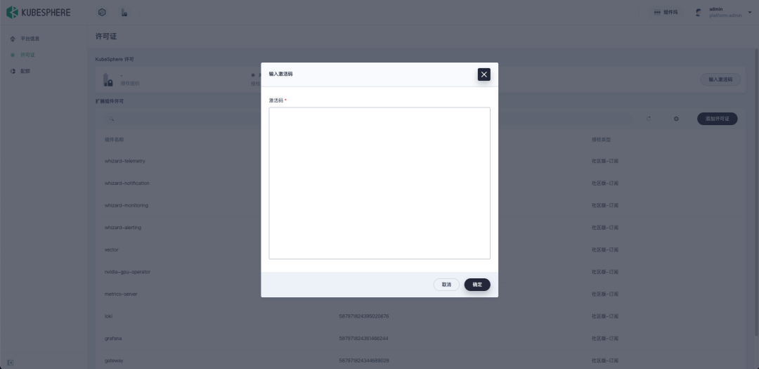 收到邮件后,复制邮件中的授权码,打开 KubeSphere 容器管理平台,进入组件坞 → 平台管理 → 许可证页面,点击添加许可证,将授权码填入即可完成激活。