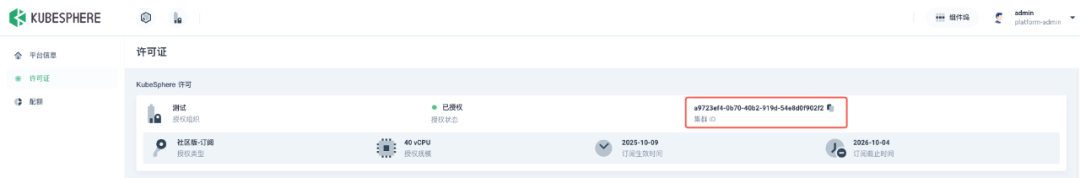 完成 KubeSphere 安装后,打开 KubeSphere 容器管理平台,进入组件坞 → 平台管理 → 许可证页面,获取当前集群的集群 ID。