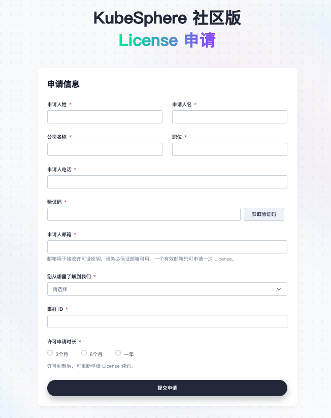 通过官方链接申请 KubeSphere 社区版的免费许可证[4],填入个人信息和集群 ID,提交申请。随后许可证将发送至您的邮箱(邮件可能会被拦截,如长时间未收到,请尝试在垃圾箱中查找)。