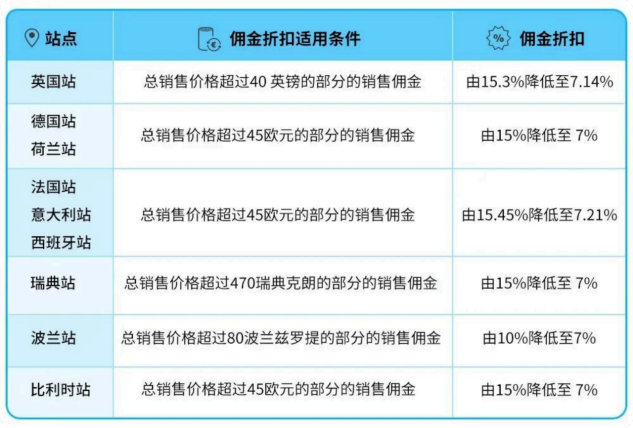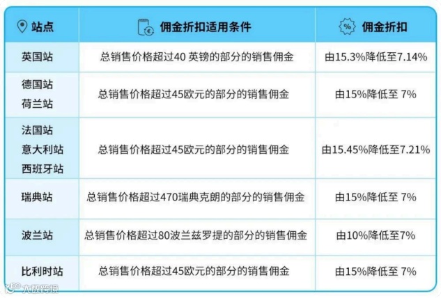 . 英国站:15英镑以下服装佣金5% ,配送费每件减少0.26英镑. 法国/意大利/西班牙站:15-20欧元商品推荐费统一为10%