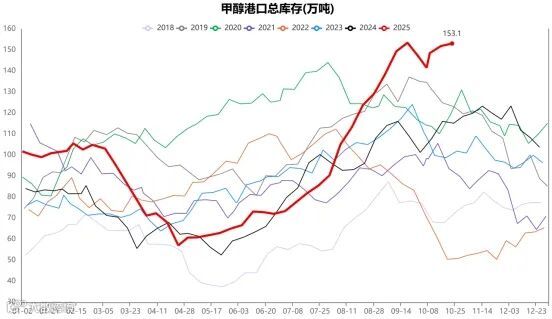 港口持续大幅累库存是压制甲醇价格的核心因素。据卓创资讯统计,截至10月23日,沿海主要地区甲醇港口合计库存在153.1万吨,处在历史最高位,比去年同期库存高了约38万吨。今年库存压力突出的原因,主要是国内和进口供应均有所明显提升,而下游需求表现平平。高库存不仅反映了供需失衡的现状,更对现货价格形成直接压制,自5月底港口进入累库季以来,甲醇现货价格以弱势走跌为主,近期现货价格跌至年内低点2200元/吨附近。