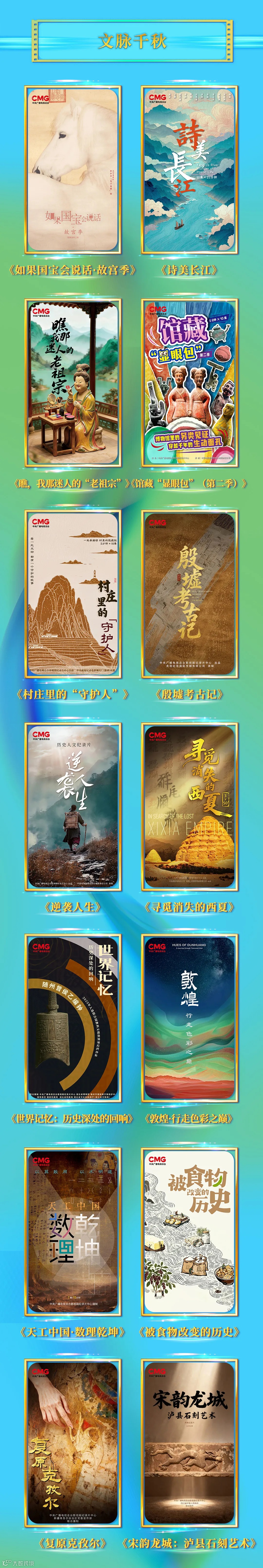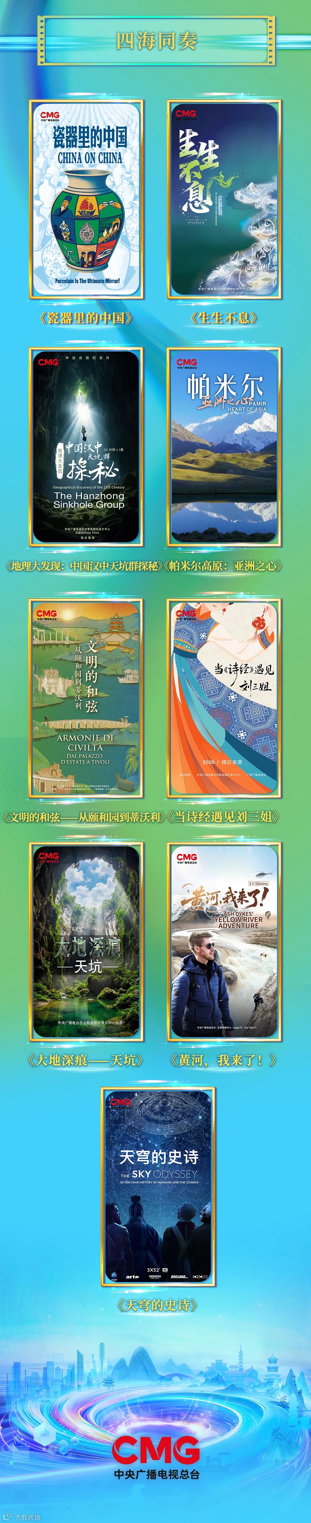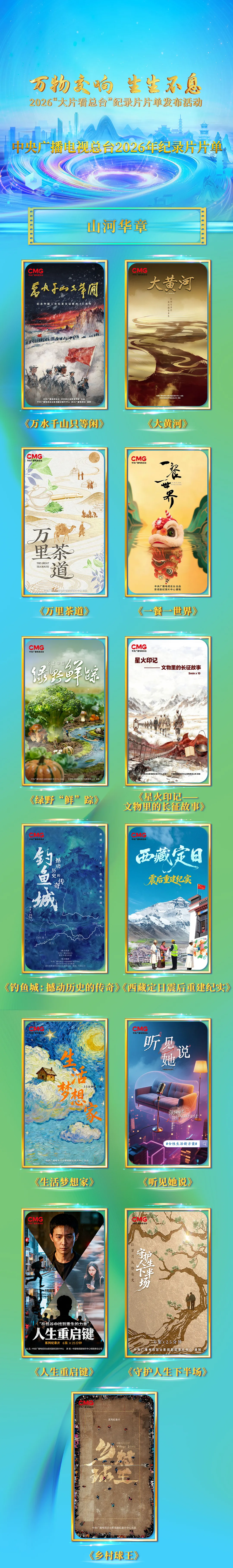 12月2日,中央广播电视总台2026年纪录片片单发布。其中涵盖“山河华章”“文脉千秋”“天地合鸣”“四海同奏”4大板块共60余部纪录片。(来源:CCTV电视剧微信公众号)
