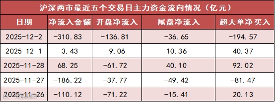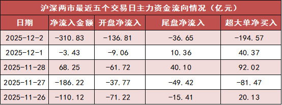 12月2日,沪深两市主力资金开盘净流出136.81亿元,尾盘净流出36.65亿元,全天净流出310.83亿元。(证券时报)
