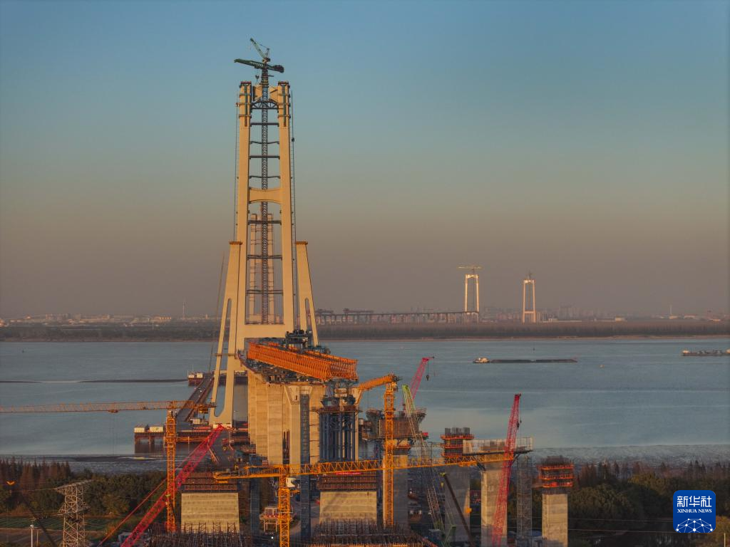 11月29日拍摄的张靖皋长江大桥南航道桥南主塔封顶施工现场(无人机照片)。新华社记者 季春鹏 摄。