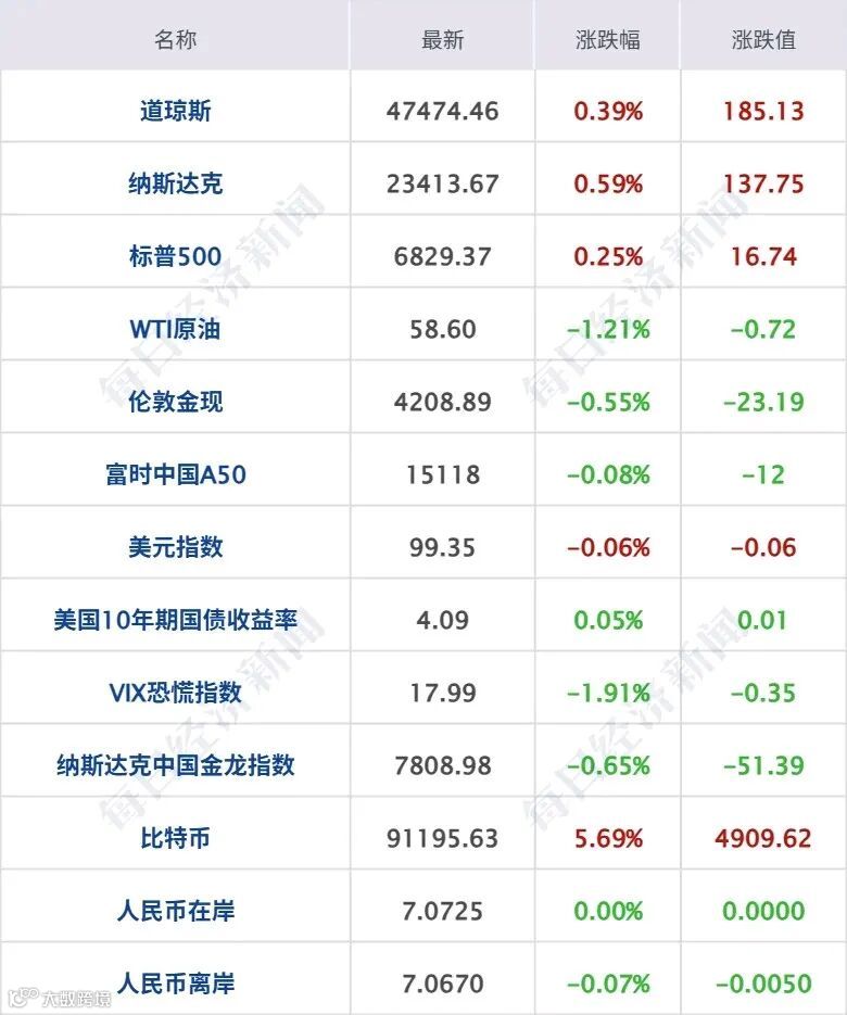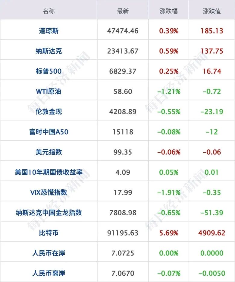 ● 美股三大指数集体收涨,道指涨0.39%,纳指涨0.59%,标普500指数涨0.25%,热门科技股涨跌不一,英特尔涨超8%,苹果涨超1%,英伟达涨近1%,博通跌超1%;半导体设备与材料、加密储备概念涨幅居前,Strategy、康特科技涨超5%,阿斯麦涨近2%,Coinbase涨超1%;波音涨超10%,创4月份以来最大单日涨幅。