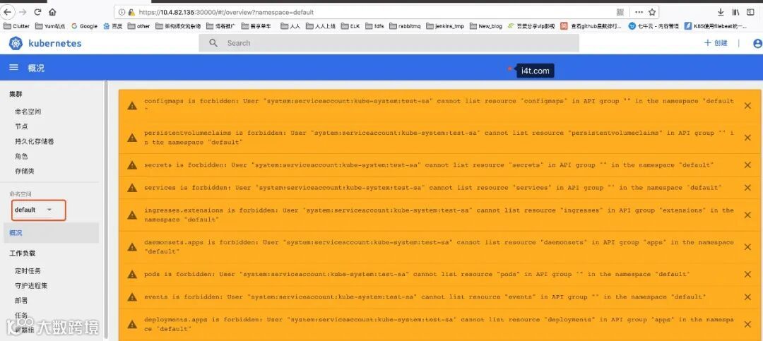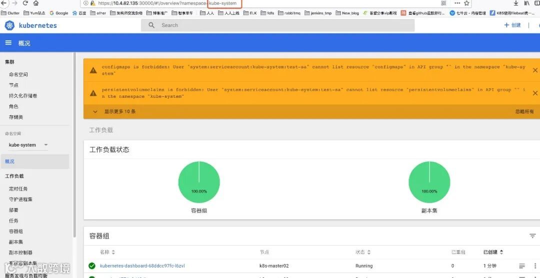 我们登陆到dashboard界面上,默认访问的为default命名空间,因为我们授权的是kube-system空间,所以很多地方没有权限。会有下面的报错