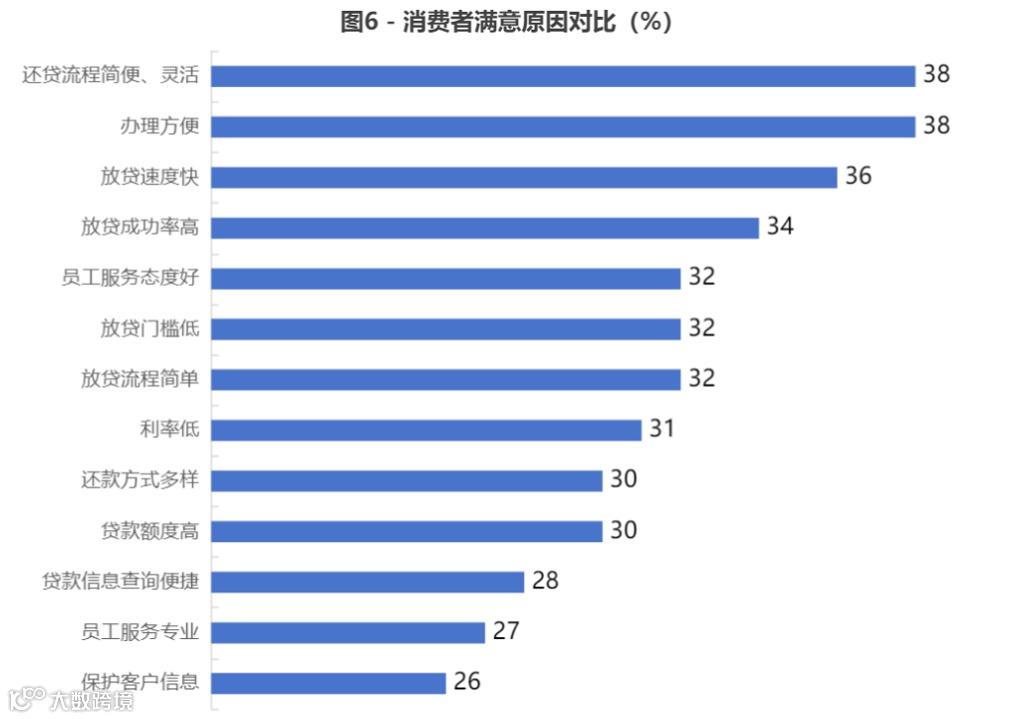 消费者对消费信贷机构满意的核心原因集中在流程与效率层面:“还贷流程简便、灵活”“办理方便”并列最高(均38%),“放贷速度快”占36%,是满意度主要驱动;“放贷成功率高”(34%)等次之,而“保护客户信息”(26%)等对满意度影响较弱,机构优化应侧重流程便捷性、放贷效率等核心环节。为此,广告投放策略需针对性展示优势(如“极速审批”),并承诺解决痛点(如“数据加密技术”)。