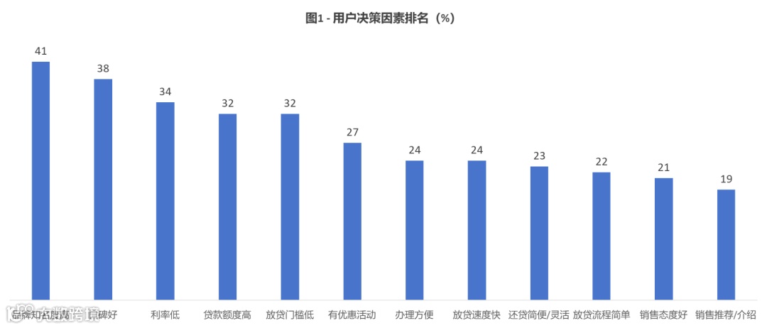 数字100数据显示,41%的消费者在选择信贷产品时优先考虑品牌知名度与口碑,其次才是利率、额度等功能性因素。因此,提升品牌可信度是增长的基础。