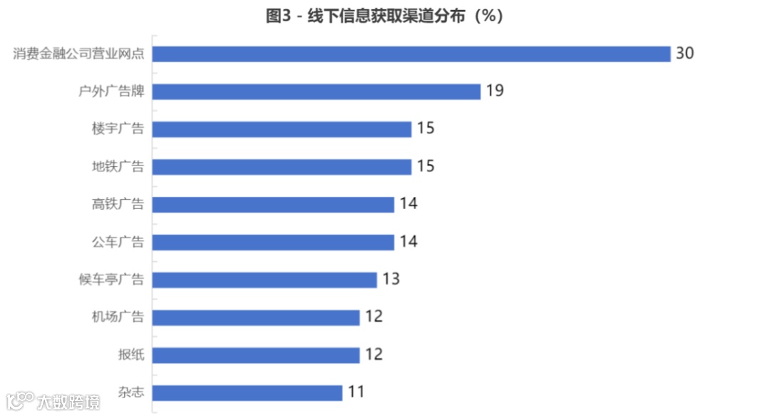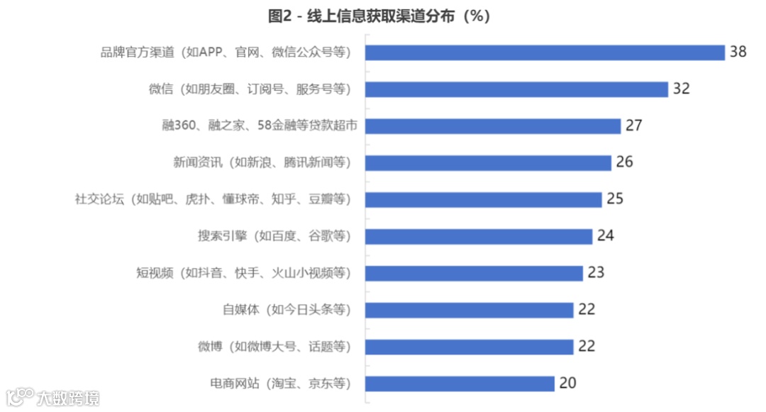 线上渠道主导:消费者线上信息获取偏好显著,“品牌官方渠道(APP、官网、微信公众号等)”以38%的占比成为最主要来源,“微信(朋友圈、订阅号等)”以32%紧随其后,二者构成核心信息获取渠道;“贷款超市”“新闻资讯”等渠道影响力次之,为此可在社交平台(如朋友圈信息流)、短视频APP(如剧情化广告)高频触达,强化记忆点。
