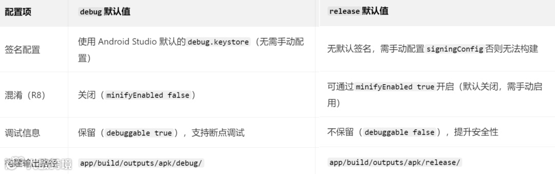 3.3、什么是“构建类型(Build Type)”?debug和release构建类型默认配置了哪些差异(如签名、混淆)?如何自定义构建类型?