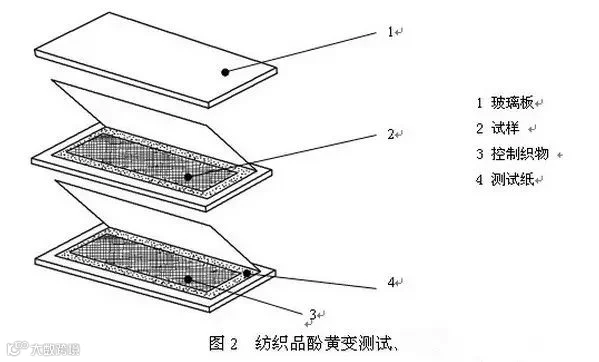 酚黄变测试:依据Caurtaulds法或ISO 105-X18:2007,使用含苯酚的测试纸包裹试样与控制织物,夹于玻璃板间并加压,用聚乙烯薄膜密封后放入规定温度烘箱中处理一段时间。取出冷却后,按GB 251灰色样卡评定沾色等级。若控制织物达到预定沾色值,则试样等级为最终结果,测试示意图见图2[k]。