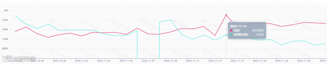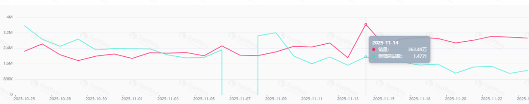 FastMoss 最新数据:TikTok Shop 美国站销量一路飙升,11 月 14 日点燃最高火柱——单日卖出 364 万件商品,环比上一周期暴涨近九成,直接把“黑五”主场灯牌抢到自己名下。