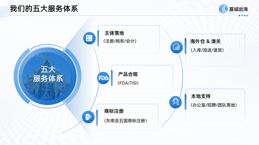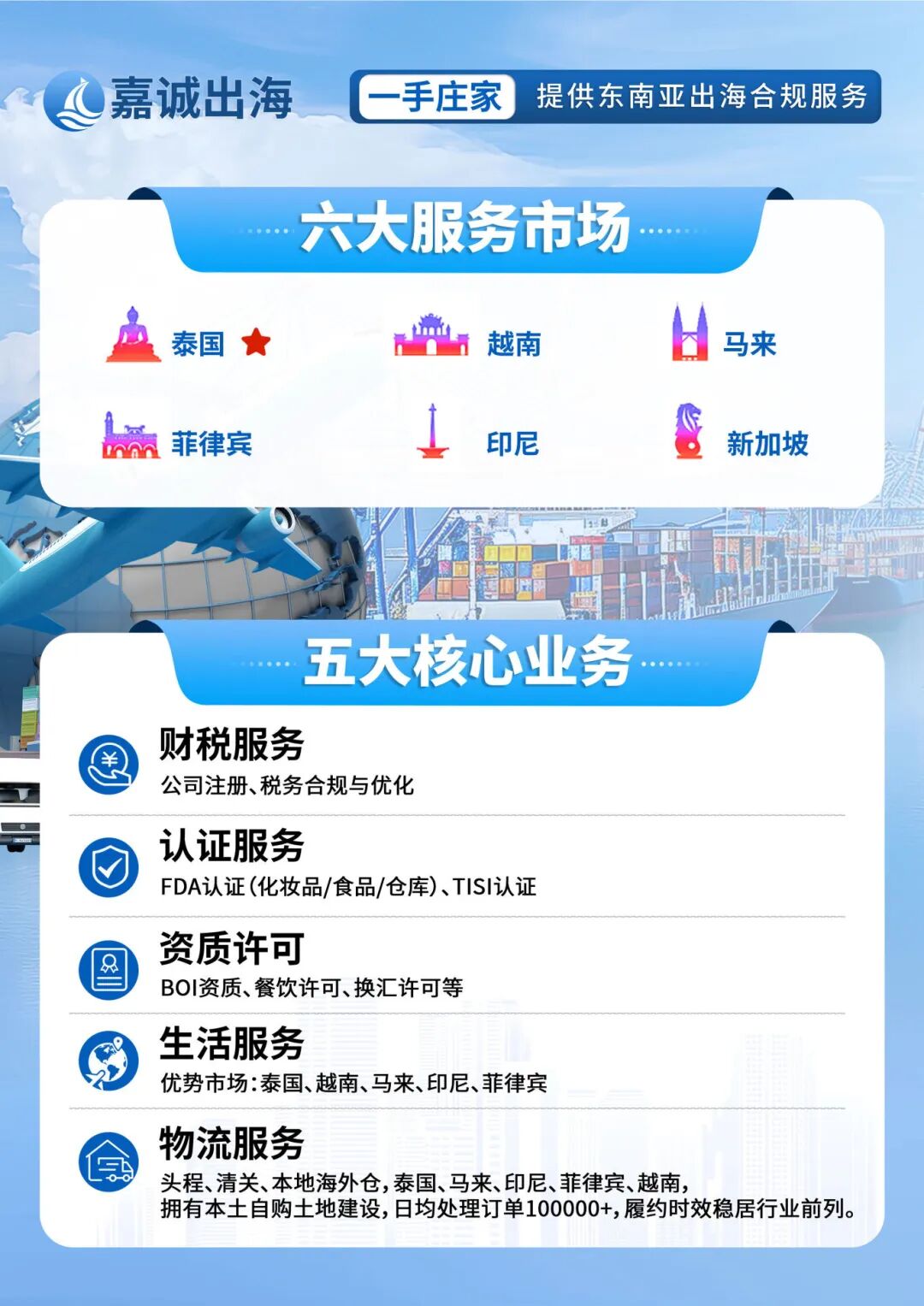 嘉诚出海在泰国可协助企业办理相关 FDA 认证及仓库挂靠、TISI 等,并根据品类规划需要的工厂开工许可证、BOI 资质、酒水/餐饮销售许可等,帮助企业在产品设计和渠道规划阶段就把合规条件纳入考量。