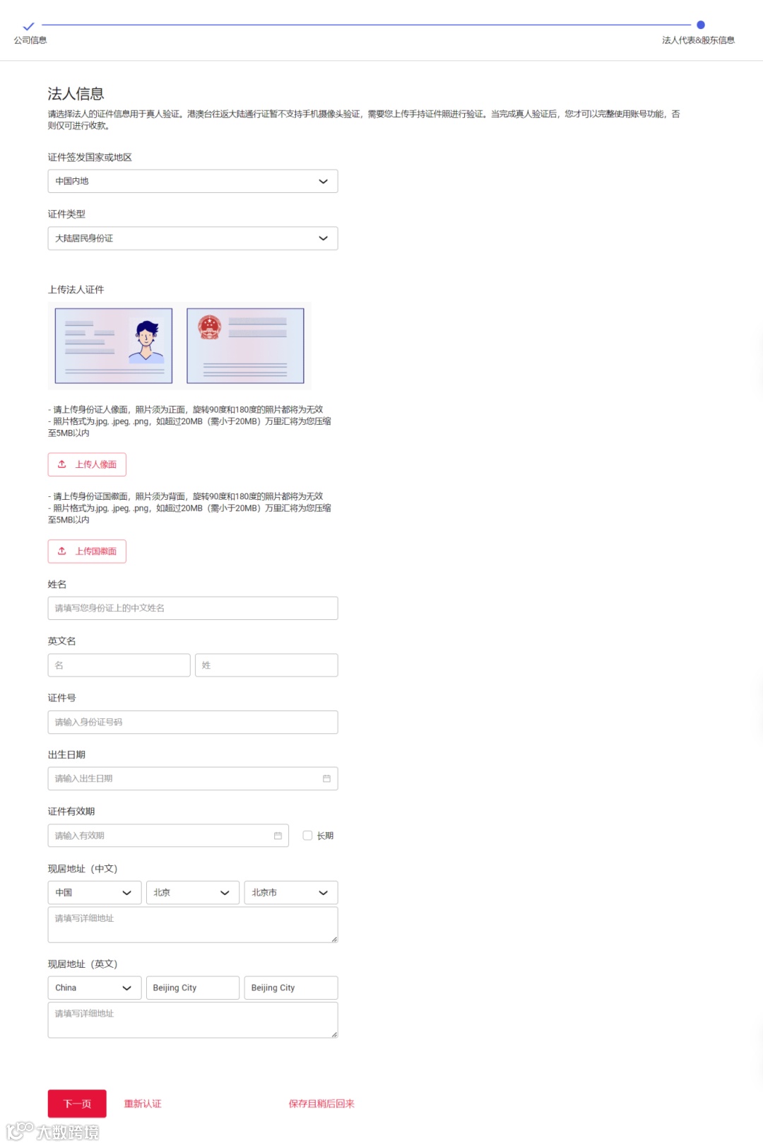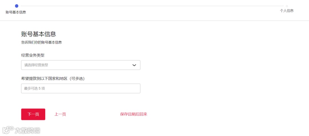 选择经营业务类型及提款国家/地区,确认后点击【下一页】。