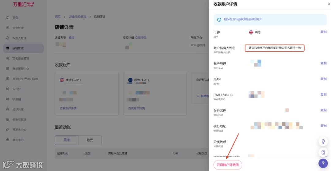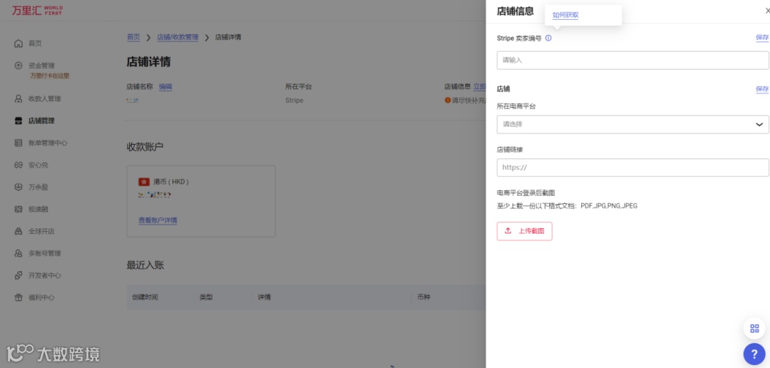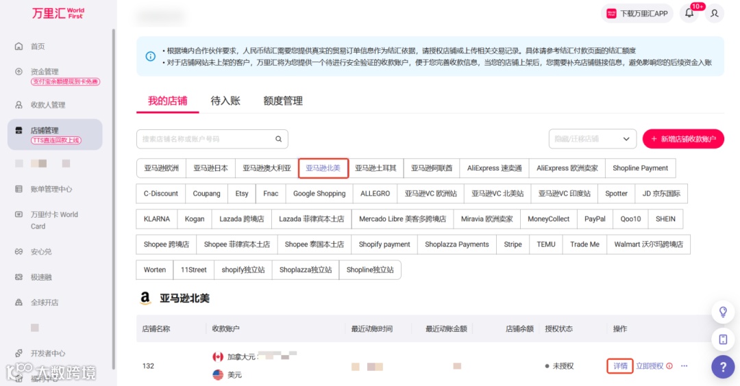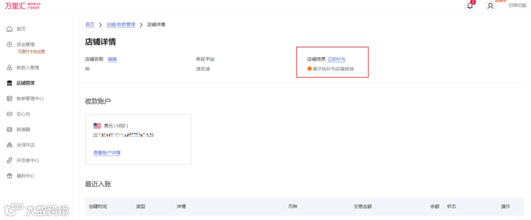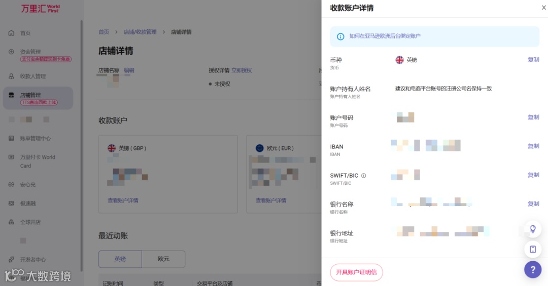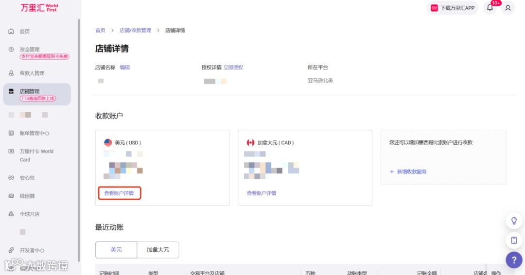 申请成功后,进入【店铺管理】→目标店铺→【详情】→【查看账户详情】,可复制账号信息用于平台绑定,并查看最近入账记录。