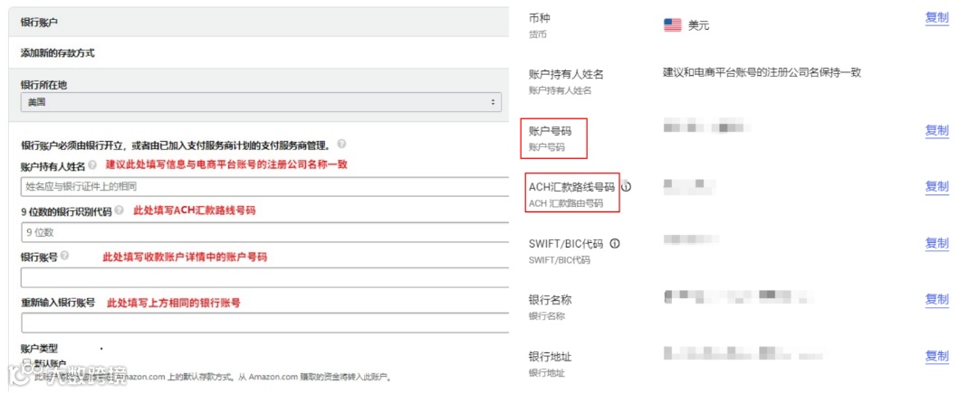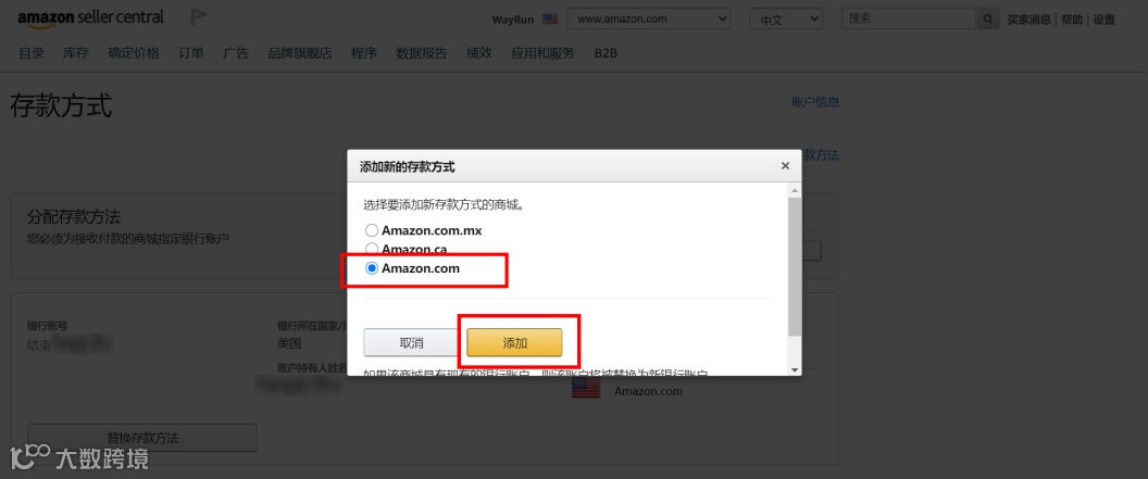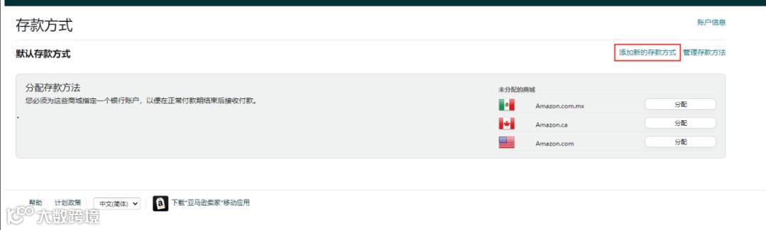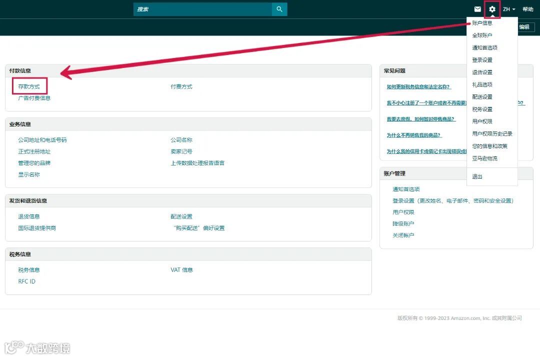 1. 登录Amazon美国站后台 → 【设置】→【账户信息】→【存款方式】;