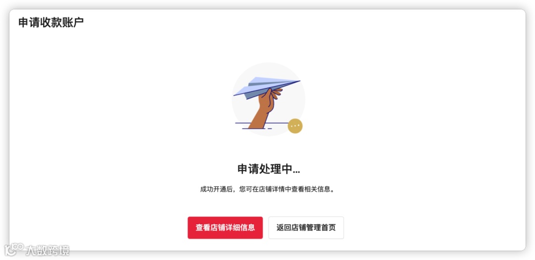 点击【申请】后显示【申请处理中】,通常1分钟内即可生成收款账号。
