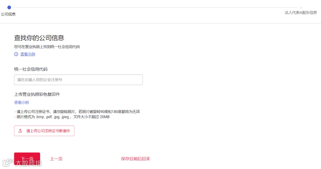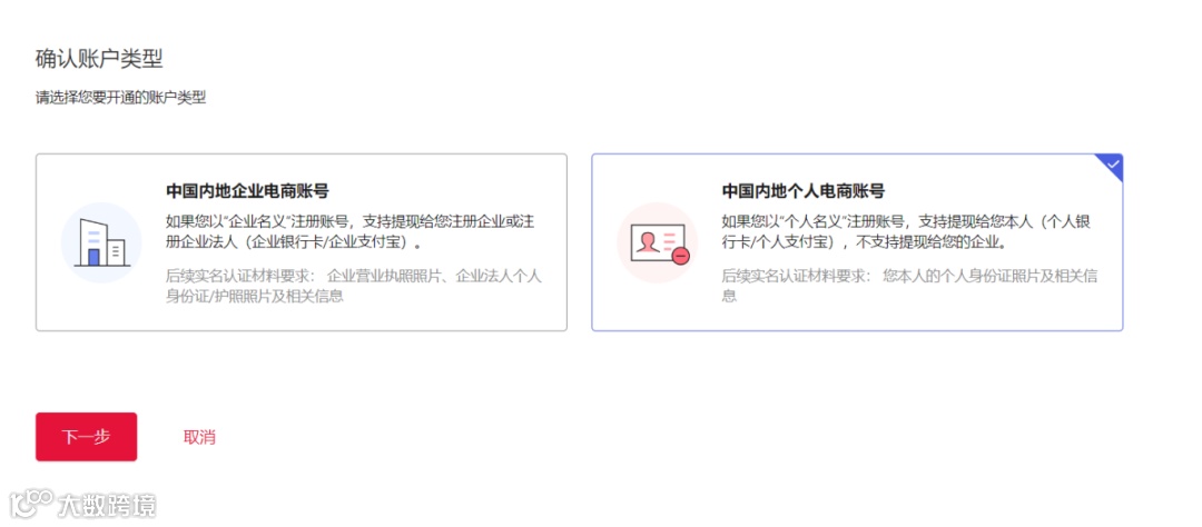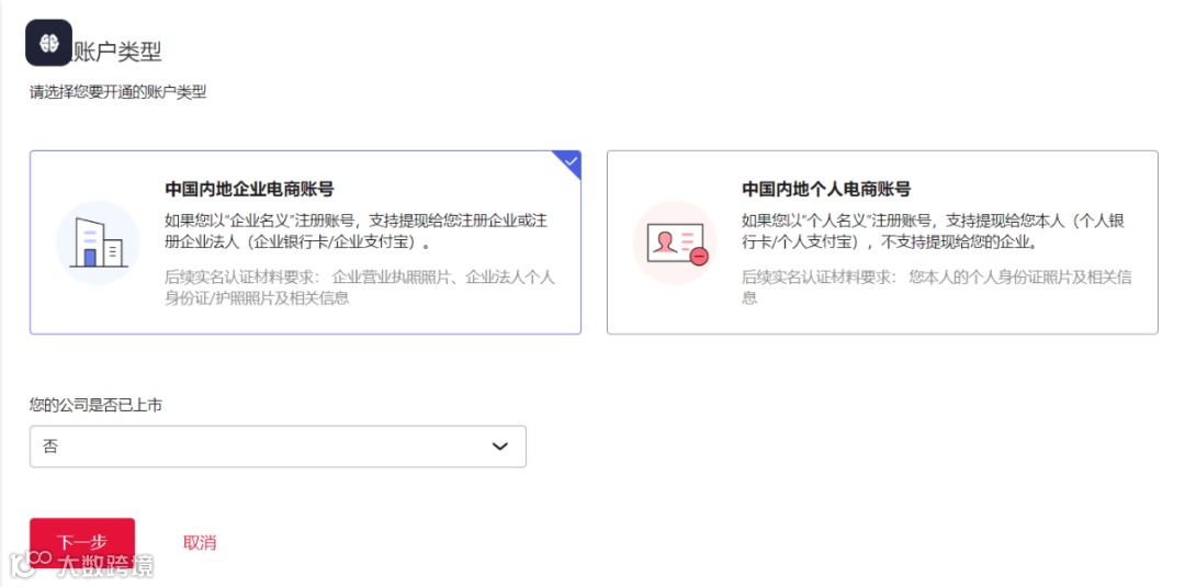 请选择【中国内地企业电商账号】,并准确填写统一社会信用代码。