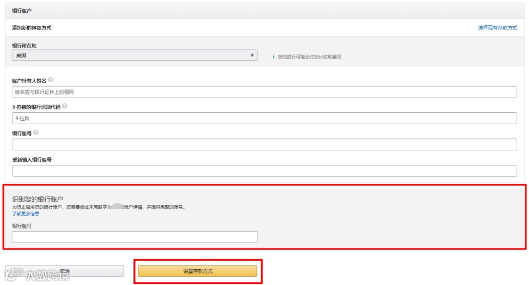 5. 若此前已添加过美元账户,需在【识别您的银行账户】中输入尾号匹配;否则直接点击【设置存款方式】完成绑定。