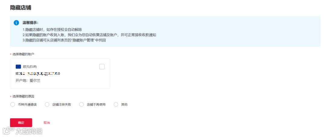 勾选需隐藏的收款账户并选择隐藏原因,点击【确定】完成操作。