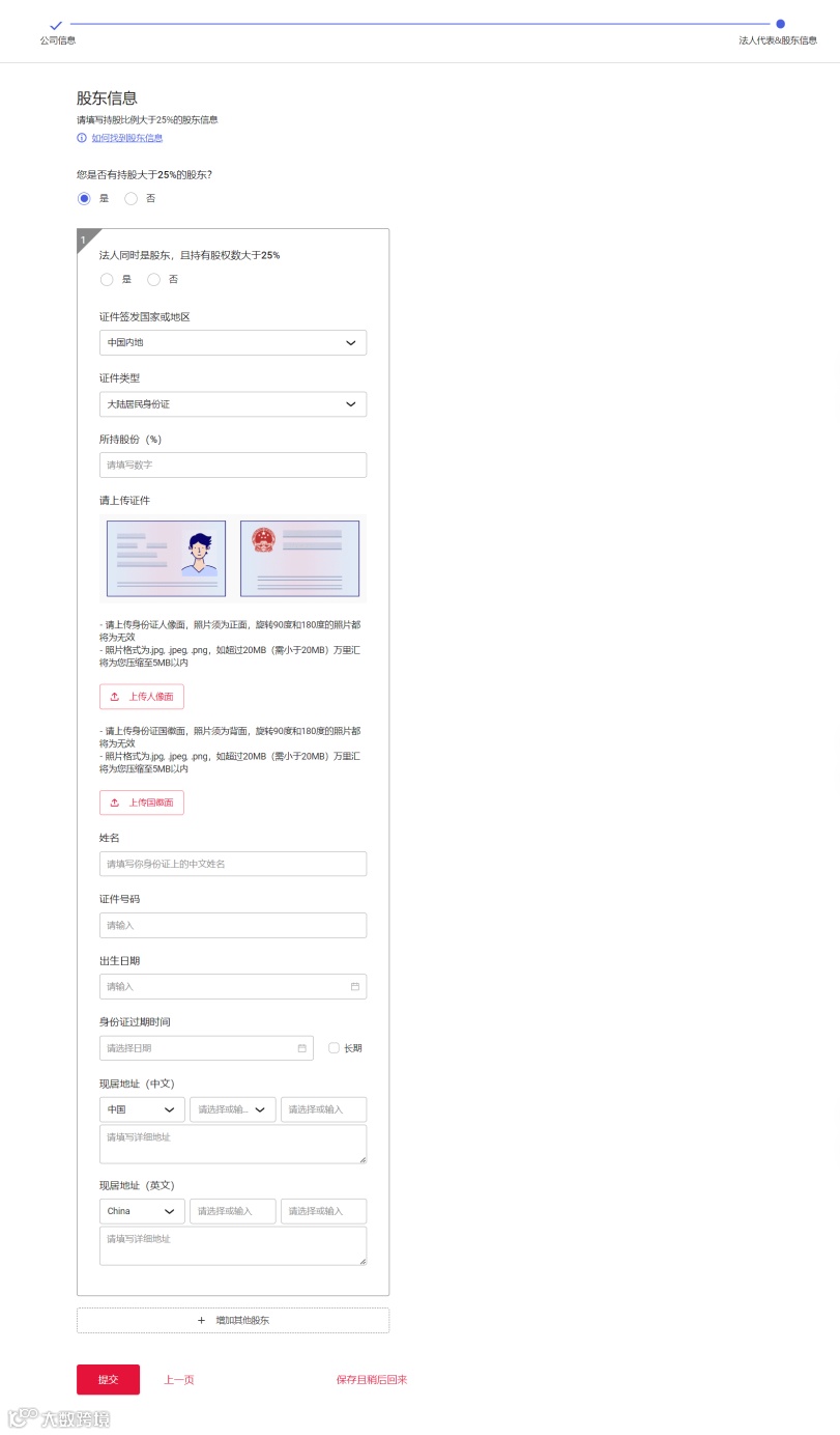 需完整填写所有持股≥25%的股东信息;若法人为100%持股,请勾选【该股东为法人-是】并填入100%,系统将自动关联法人信息。