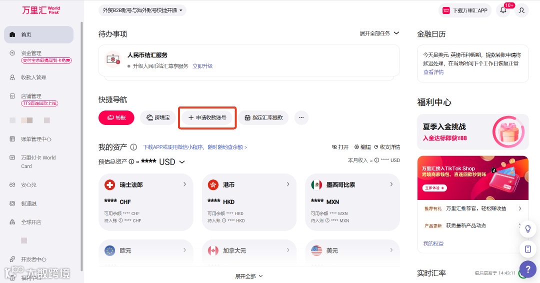 登录万里汇账户门户,首页快捷导航中点击【申请收款账户】。