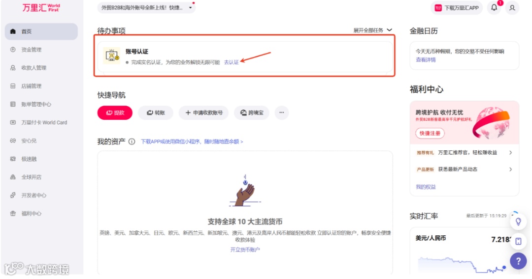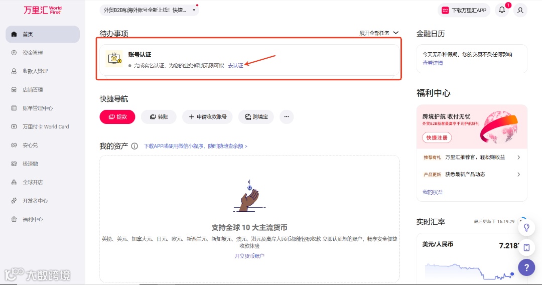 完成注册后进入万里汇后台首页,在“待办事项”中点击【去认证】,启动实名认证流程。