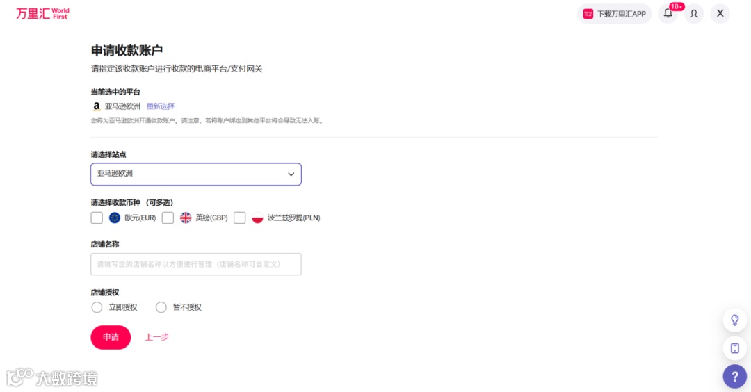 在申请界面中,选择已绑定的电商平台或支付网关(如Amazon、Shopify等)。