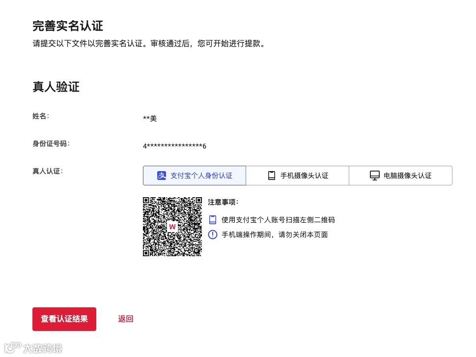 选择【支付宝个人身份认证】,使用手机支付宝扫描二维码完成人脸识别认证;认证过程中请勿关闭电脑端页面。