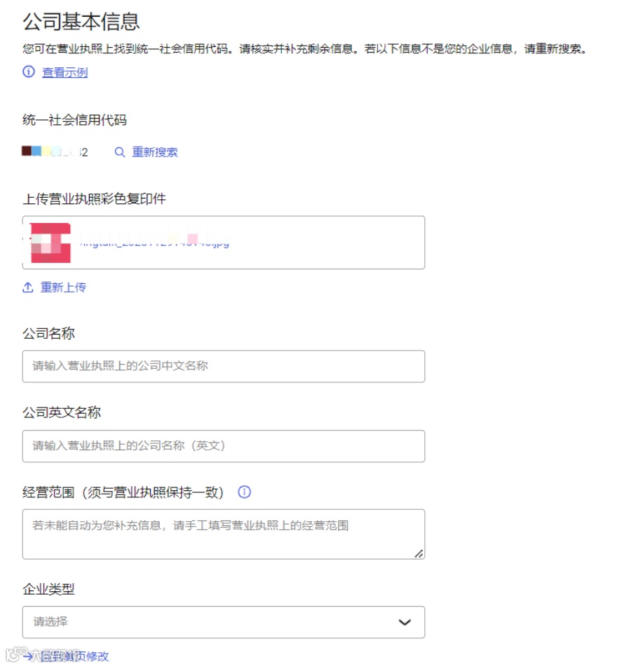 上传营业执照后,系统将自动反填企业信息;如未匹配成功,可手动点击【搜索企业资料】补全。