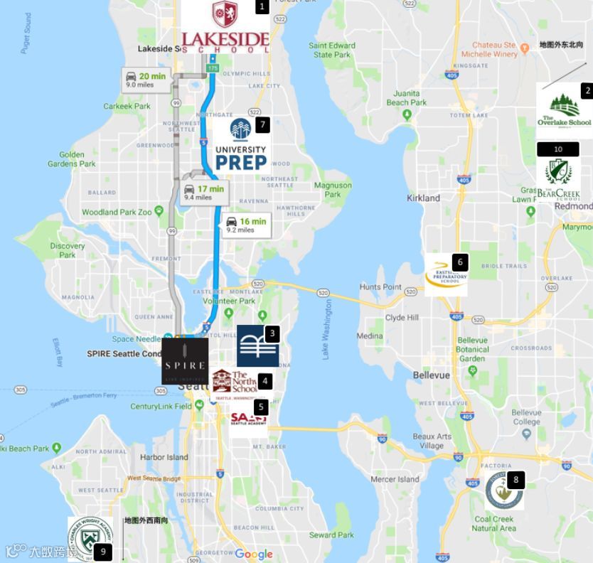 (西雅图市部分私立中小学分布图,来源于谷歌地图)