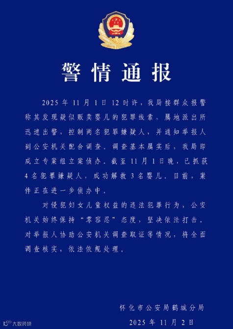 导读:湖南怀化警方解救3名婴儿 湖南省怀化警方发布警情通报:11月1日12时许,接群众报警称其发现疑似贩卖婴儿的犯罪