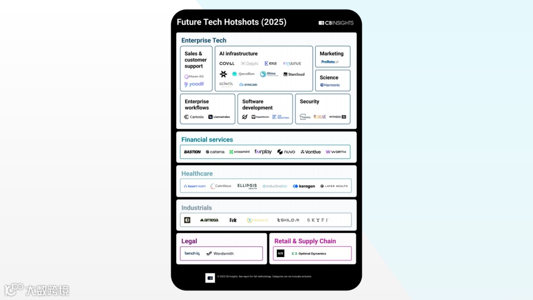 CB Insights 发布的《2025 Future Tech Hotshots:Scouting Reports》报告,结合生成式 AI 分析与专有 Mosaic 评分体系,从全球海量初创企业中遴选出 45 家最具潜力的科技公司。