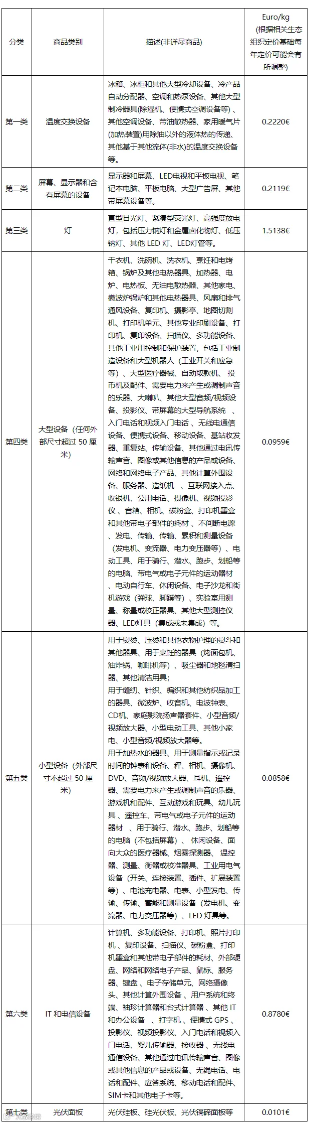 商品范围及生态贡献费的单位成本:根据西班牙法规和生态环保组织要求,电气电子设备、电池和蓄电池所涵盖的商品范围及单位成本如下表。