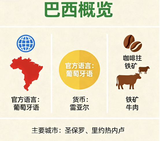巴西全称巴西联邦共和国,国土 851.6 万平方公里(全球第五),2025 年人口约 2.17 亿,官方语言葡萄牙语,首都巴西利亚。并且是拉美最大经济体,2023年经济实力居世界第九,农牧业发达(全球最大大豆、咖啡出口国),服务业占 GDP 近六成;是金砖国家、二十国集团等多边组织成员,2024 年加入 “欧佩克 +” 观察员。