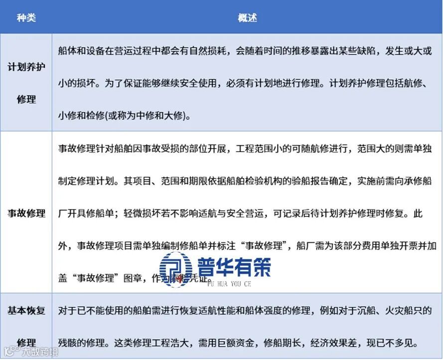 船舶修理是指船舶的船体和结构、机器或设备、舾装或构造、系统等在船坞或船厂进行修理,以达到其原设定的状态或功能要求并能够继续使用的行业。根据我国交通部颁布的《修船条例》及《修船工作会议纪要》,船舶修理主要分为计划养护修理、事故修理和基本恢复修理三大类。其中,计划养护修理包括航修、小修和检修,是为应对船舶营运中的自然损耗而进行的有计划修理;事故修理针对船舶因事故损坏的部分开展,范围和期限依验船报告确定;基本恢复修理则是对沉船、火灾船只等失去使用能力的船舶进行适航性能和船体强度恢复的修理,目前此类修理因成本高、效果差已不多见。